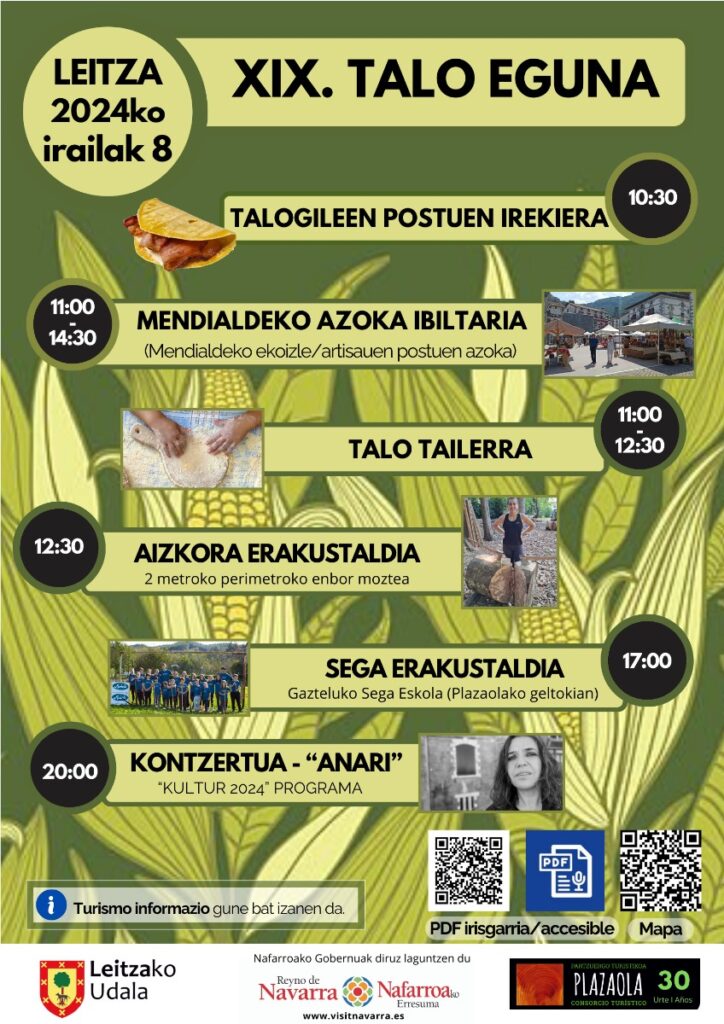 El 8 de septiembre, Leitza celebrará la decimonovena edición del Talo Eguna. Como todos los años, se podrá comer y aprender a hacer talos y no faltarán exhibiciones de deporte rural. Además, al igual que el año pasado, la cita se sumará a la Feria Itinerante de Mendialdea, en la que los visitantes podrán adquirir los alimentos que producen en la comarca y los trabajos de los artesanos.